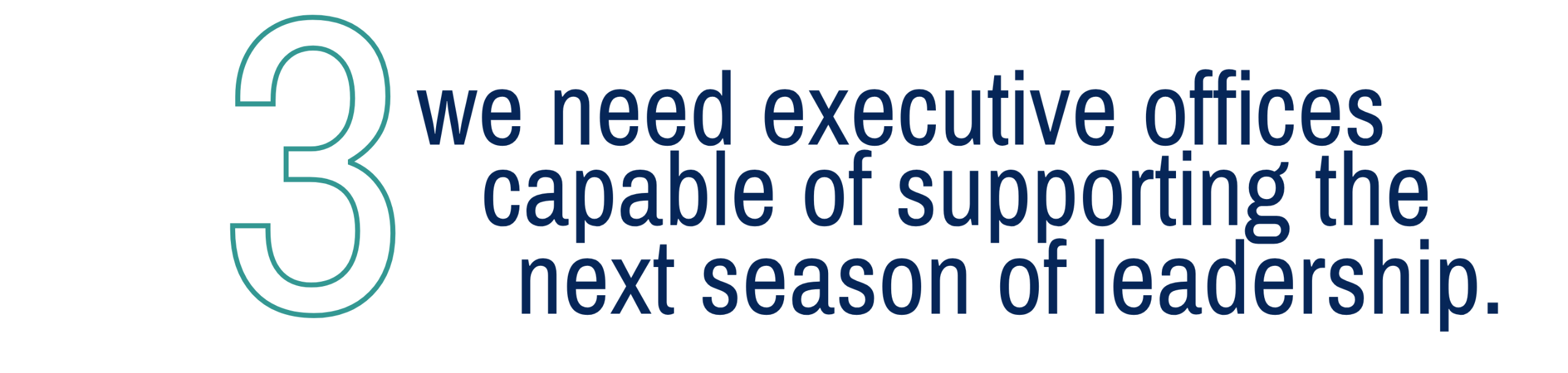 Third, we need executive offices capable of supporting the next season of leadership, strategy, and pastoral care. To shepherd thousands well, to serve families effectively, and to lead with clarity into the future, we need an operational base that reflects both the responsibility and the opportunity before us.